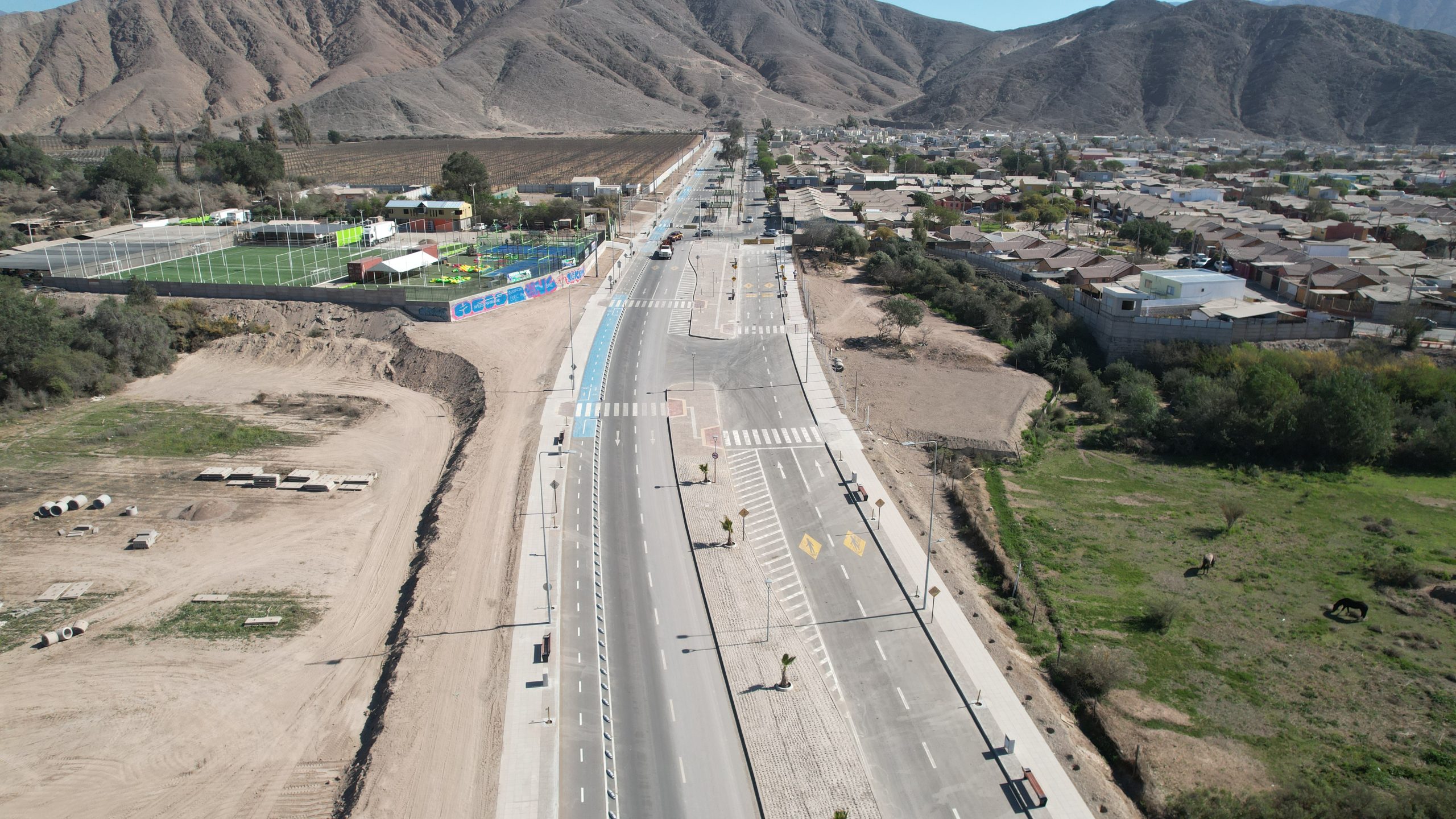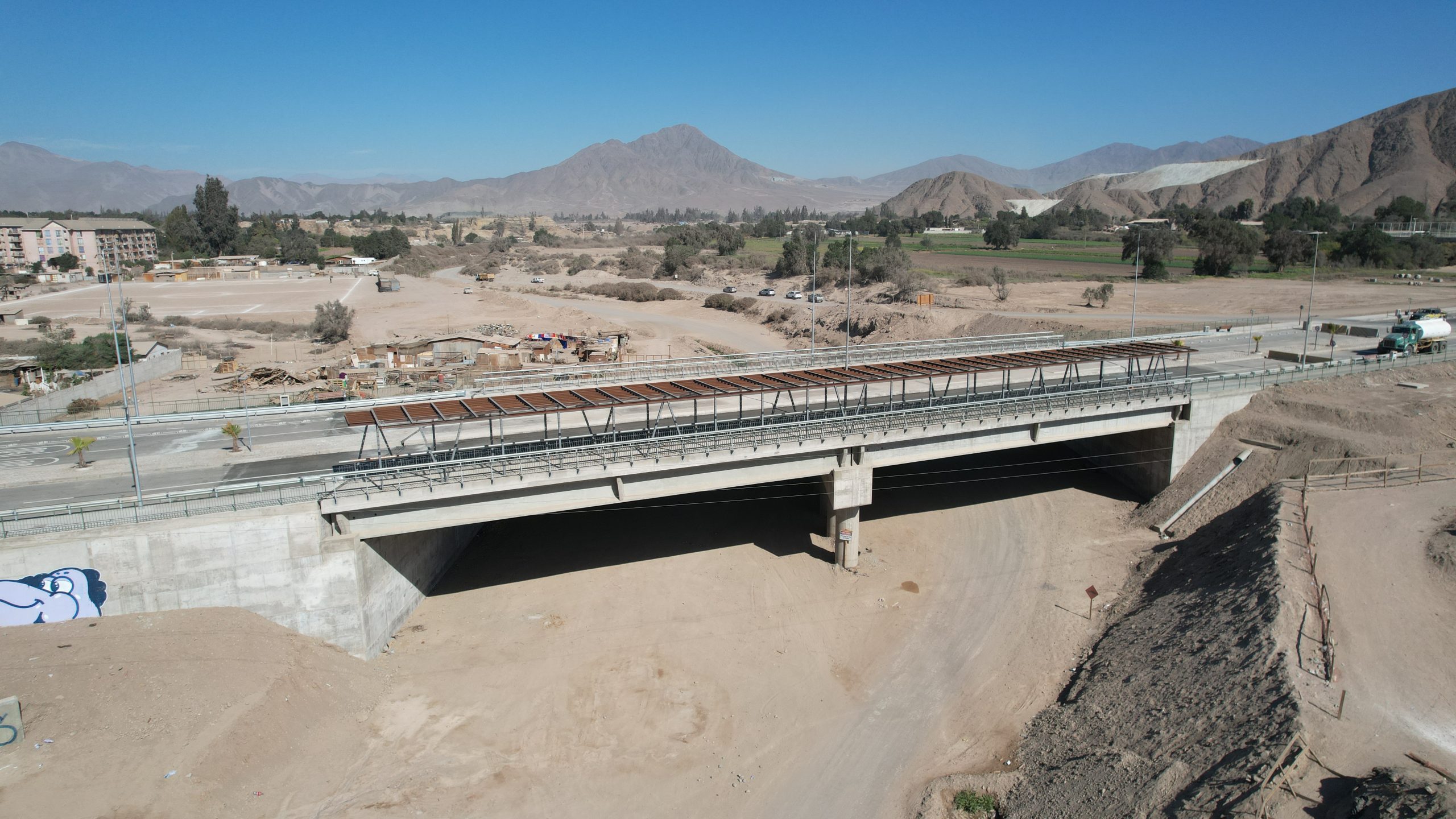 El proyecto, ubicado en Av. Diego de Almagro de la comuna de Copiapó, región de Atacama, consiste en la construcción de un puente de hormigón con cepa central y vigas pretensadas de largo 60 m, pavimentación de dos calzada en asfalto de una extensión de 1.300m separadas por un bandejón central, veredas en baldosas microvibradas, ciclovía, paisajismo, señalización y demarcación vial, mobiliario urbano, etc.